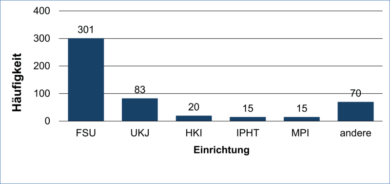 Abbildung 6: Aktuelle Promotionseinrichtung. FSU – Friedrich-Schiller-Universität, UKJ – Universitäts-klinikum, HKI – Hans-Knöll-Institut, IPHT – Leibniz-Institut für Photonische Technologien, MPI – Max-Plank-Institute. Mehrfachnennungen möglich. (n = 465)