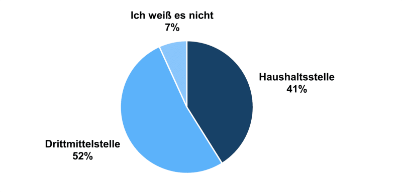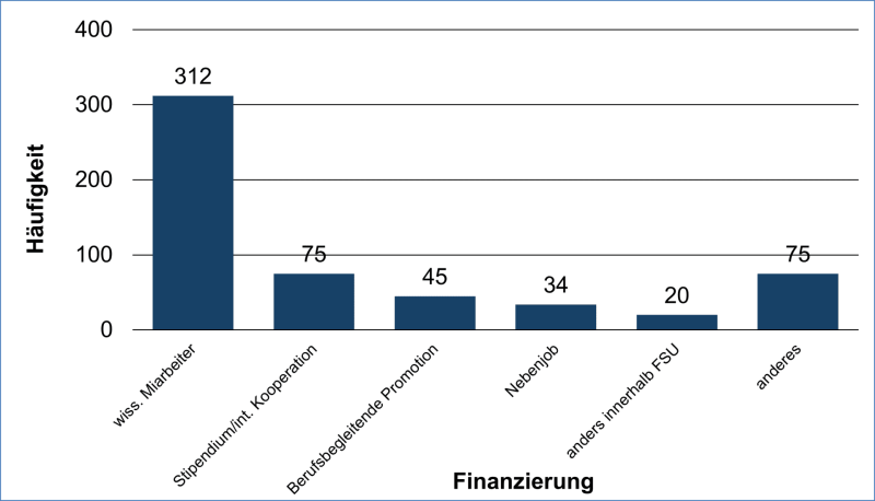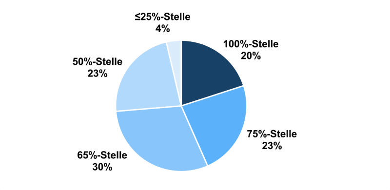 Die häufigste Finanzierungsquelle der Promovierenden ist die Anstellung als wissenschaftliche Mitarbeitende. Dieses Arbeitsverhältnis wurde näher untersucht. Die große Mehrheit der wissenschaftlichen Mitarbeitenden ist teilzeitbeschäftigt (80 %). Den größten Teil machen dabei 65%-Stellen aus (30 % der Befragten), gefolgt von 75%-Stellen (23 %) und 50%-Stellen. Geringere Vertragsarbeitszeiten sind mit 4 % die Ausnahme.