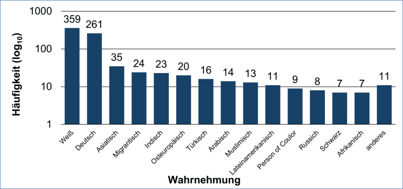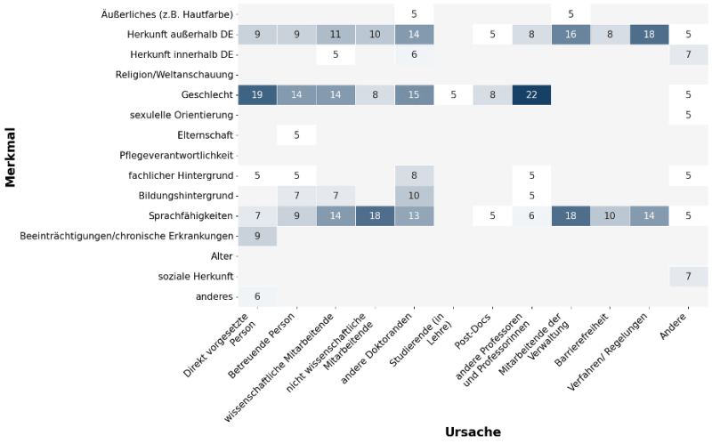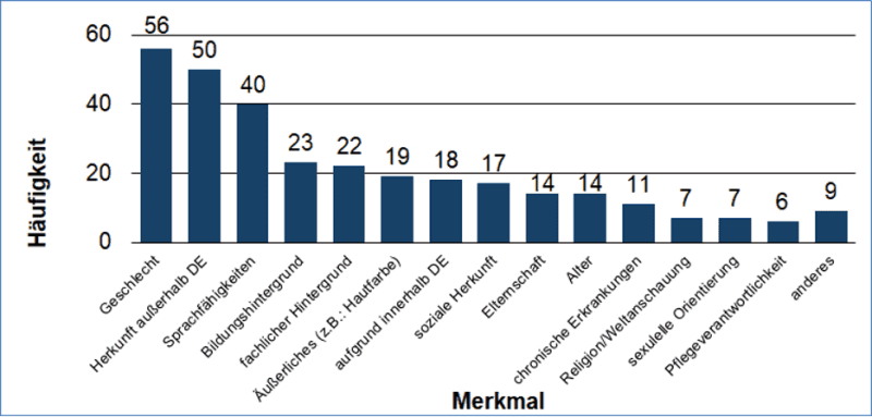 Die Teilnehmenden Personen ordneten ihre Erfahrungen meist, der Diskriminierung aufgrund des Geschlechts, der Diskriminierung aufgrund der Herkunft, Sprachfähigkeit oder Aussehen und der Diskriminierung aufgrund des Bildungshintergrundes und der sozialen Herkunft zu. Elternschaft, Fachlicher Hintergrund, Alter und Herkunft innerhalb Deutschlands zeigen hier eine ungleichmäßige Verteilung.