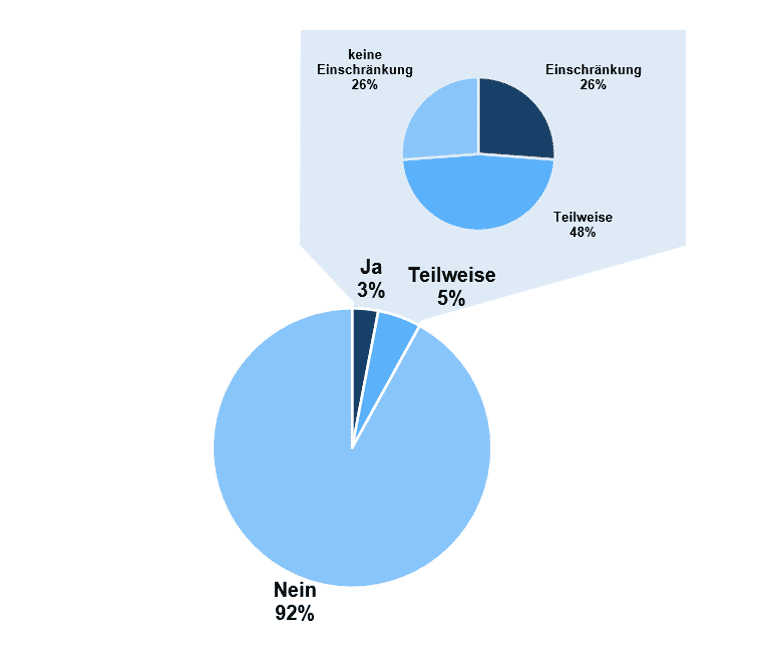Abbildung 35: Erlebte Sprachbarriere. Im Hauptdiagramm ist dargestellt, ob die Personen eine Sprachbarriere erfahren haben (n = 497). Im Einsatz ist dargestellt, ob die Promovierenden die "Ja" oder "Teilweise" geantwortet haben, dadurch in der Bearbeitung ihres Promotionsprojektes Ein-schränkungen erfahren haben. (n = 42)
