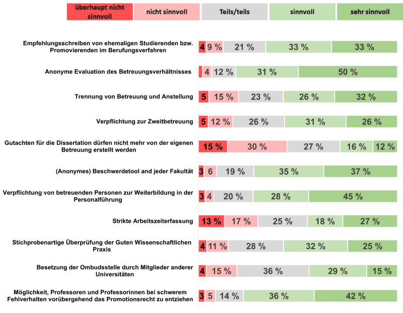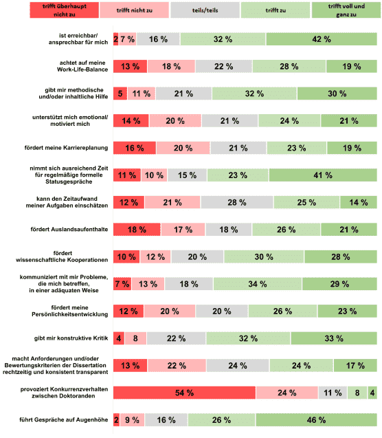 55 % der Befragten sind mit ihrer Betreuung im Allgemeinen zufrieden, zwei Drittel bewerten das Arbeitsklima in ihrem Umfeld als mindestens gut. Gelobt wurden die Erreichbarkeit der Betreuer, methodische und inhaltliche Unterstützung, Kommunikation und die Förderung wissenschaftlicher Kooperation. 61 % kritisieren, dass die betreuende Person zumindest teilweise den Zeitaufwand der zu erledigenden Aufgaben falsch einschätzt. Dazu kommen 53 % die mindestens teilweise eine fehlende Achtung vor der Work-Life-Balance angeben. Im gleichen Umfang wird kritisiert, dass die Karriere- und die Persönlichkeitsentwicklung, beides zentrale Bausteine des Promotionsprozesses, nicht ausreichend berücksichtigt werden. 23 % kritisieren, dass die betreuende Person zumindest teilweise Konkurrenzverhalten zwischen Promovierenden provoziert.
