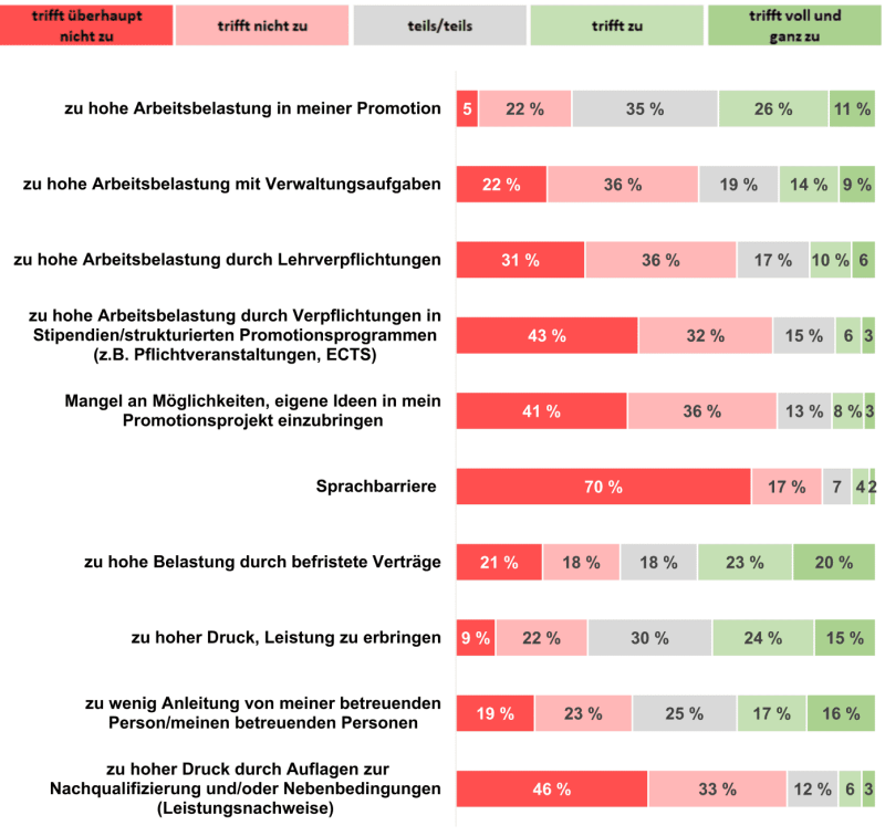Promovierende berichten zudem von zu hoher Belastung durch befristete Arbeitsverträge und großem Leistungsdruck. Eine von drei Personen berichtet von psychischen Problemen während der Promotion. Darüber hinaus spielen auch finanzielle und familiäre Probleme eine Rolle. Etwa 20 % äußern Ängste bei der Interaktion mit Betreuenden, die auch den wissenschaftlichen Erfolg des Promotionsprojektes beeinträchtigen.