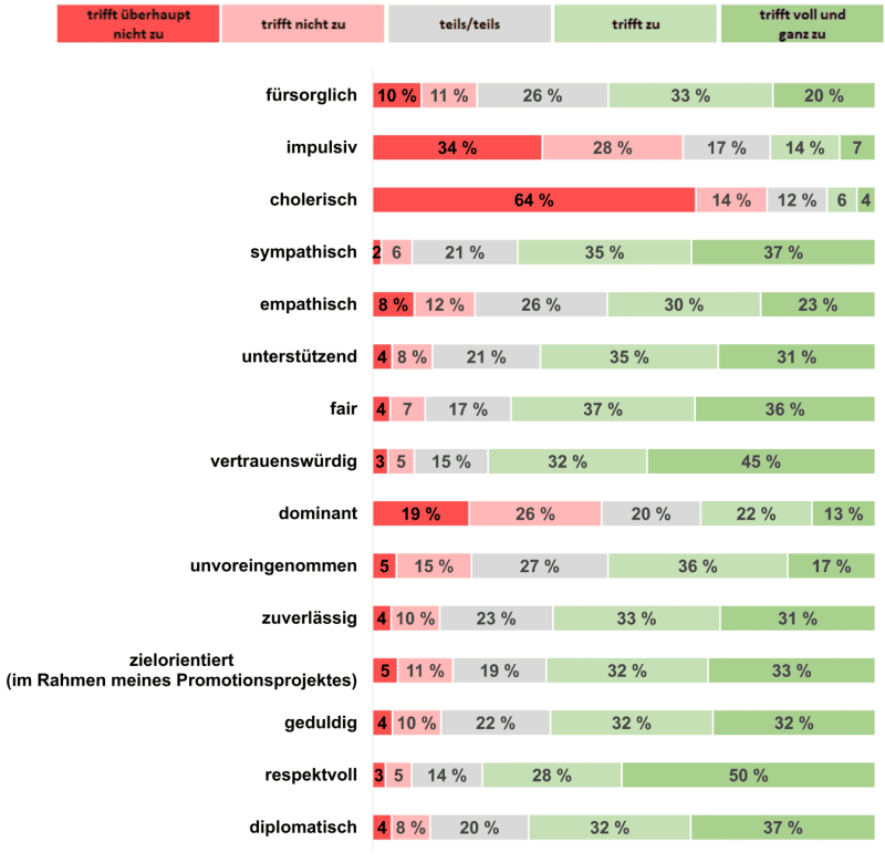Betrachtet man den persönlichen Umgang zwischen Promovierenden und Betreuenden fanden sich die überwiegende Menge der Teilnehmer mit Respekt behandelt und empfanden ihre Betreuenden als vertrauenswürdig. 20% sehen ihre betreuende Person als nicht empathisch, 53% beschreiben sie dagegen als fürsorglich. 38 % beschreiben ihre betreuende Person als zumindest teilweise impulsiv, 35 % als dominant.