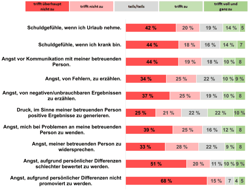 Auch Ängsten und Schuldgefühlen gegenüber der betreuenden Person sind bei einigen Befragten Teil der Promotion. So empfinden 19 % Schuldgefühle, wenn sie sich Urlaub nehmen wollen und 21 %, wenn sie krank sind. Auch Angst von Fehlern zu berichten oder sich bei Problemen an die betreuende Person zu wenden, betreffen etwa 20 % der Promovierenden. Weitere 32 % der Teilnehmenden fühlen sich gedrängt, positive Ergebnisse im Sinne der betreuenden Person zu generieren und so, von der guten wissenschaftlichen Praxis, unvoreingenommen Ergebnisse zu betrachten, abzurücken. Auch das starke Machgefälle zwischen Promovierenden und Betreuenden spiegelt sich in den Antworten wider: 39 % haben mindestens teilweise Angst ihrer betreuenden Person zu widersprechen, 30 % gaben an, mindestens teilweise Angst vor schlechtere Bewertung aufgrund persönlicher Differenzen zu haben und 16 % gaben an, zumindest eine teilweise Angst zu haben, sogar deswegen nicht promoviert zu werden.