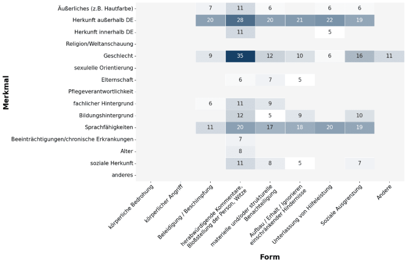 Während alle Gruppen von herabwürdigenden Kommentaren betroffen sind, zeigt sich, dass direkte Beleidigungen meist auf Herkunft (20), Sprache (11) und Aussehen (7), zudem Geschlecht (9) und den fachlichen Hintergrund (6) zielen. Strukturelle Benachteiligung findet aufgrund von Herkunft (20), Sprache (17), Geschlecht (12), fachlichem Hintergrund (9), sozialer Herkunft (8), Elternschaft (7), Aussehen (6) und Bildungshintergrund (5) statt.