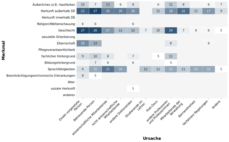 Der Bildungshintergrund wird primär durch andere Promovierende, sekundär wissenschaftliche Mitarbeiter und die betreuende Person, tertiär andere Professoren und Professorinnen als Anlass zur Diskriminierung genommen. Bei Diskriminierungen aufgrund von Elternschaft ist es sogar nur die betreuende Person, während bei Diskriminierung aufgrund von Beeinträchtigungen und chronischen Erkrankungen nur die direkt vorgesetzte Person als Urheber von Diskriminierungen genannt wird.