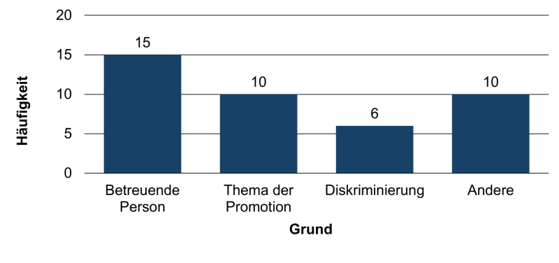 Alle bisher genannten Probleme sind nicht folgenlos. So denken 30 % der Promovierenden mehrfach, regelmäßig oder täglich über einen Abbruch der Promotion nach. 5 % der Befragten gaben an, dass sie bereits eine Promotion abgebrochen haben, 52 % davon an der Universität Jena. Als Ursache wurden 15 mal die betreuende Person angeführt und 6 mal wurde konkret Diskriminierung als Grund genannt (Überschneidungen wegen Multiple-Choice möglich).