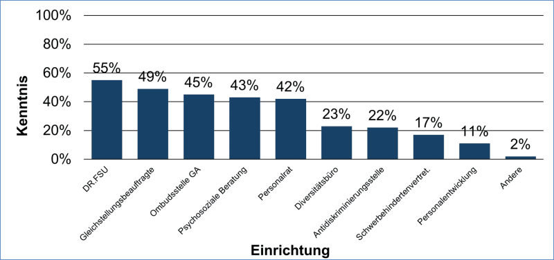 Dabei ergab sich, dass 35 % der Befragten die Funktion einer Ombudsperson allgemein nicht bekannt war, 52 % der Befragten hatten keine Kenntnis von der Existenz der Ombudsstelle der Graduiertenakademie. Gleichstellungsbeauftragte, Psychosoziale Beratung und Personalrat sind nur jeder zweiten Person bekannt (42 bis 49 %). Diversitätsbüro, Antidiskriminierungsstelle, Schwerbehindertenvertretung und Personalentwicklung sind bei weniger als 25 % der Promovierenden bekannt. 13 % der Befragten gaben an gar kein Hilfsangebot zu kennen.