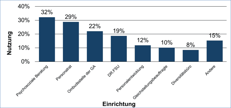 13 % der Befragten gaben an, schon mindestens einmal eins der Hilfsangebote genutzt zu haben. Die Nutzung verteilt sich auf die psychosoziale Beratung mit 32 %, der Personalrat mit 29 %, gefolgt von der Ombudsstelle mit 22 % und dem DR.FSU mit 19 %. Die höchste Zufriedenheitswerte erhielten die psychosoziale Beratung, der DR.FSU und das Diversitätsbüro. Da Mehrfachnennungen erlaubt waren und die Problemstellung nicht berücksichtigt war, darf anhand dieser Statistik kein direkter Vergleich der Institutionen stattfinden.