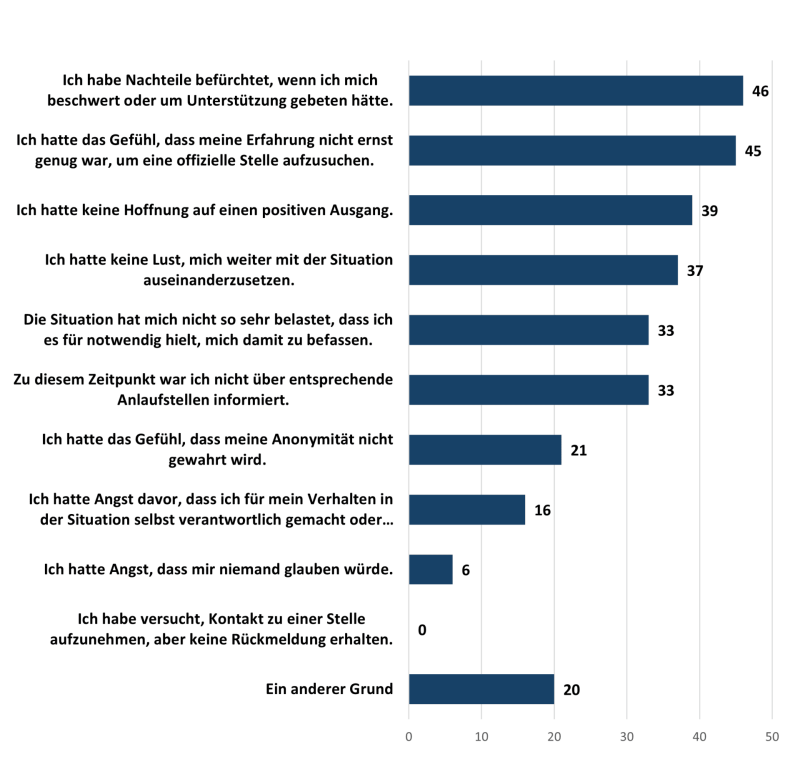 46 Mal wurde angegeben, dass durch eine Beschwerde oder Bitte um Unterstützung Nachteile befürchtet wurden. 39 mal hatte die betroffene Person keine Hoffnung auf einen positiven Ausgang. Die Sorge, dass die Anonymität nicht gewahrt würde, war 21 mal ein Faktor, weshalb keine Unterstützung gesucht wurde. „Angst, dass mir niemand glauben würde“ wurde 6 mal angegeben. Weitere 16 Personen hatten Angst, selbst für die Situation verantwortlich gemacht oder beschuldigt zu werden.