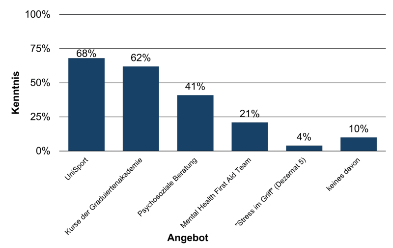 Auch die Bekanntheit verschiedener universitärer Angebote rund um das Themen Psyche und Gesundheit wurde abgefragt. Entsprechende Kurse des UniSport und der Graduiertenakademie sind rund zwei Dritteln bekannt. Die psychosoziale Beratung war 41 % bekannt, dass Mental Health First Aid Team nur 21 %. Das Programm „Stress im Griff“ von Dezernat 5, welches sich an Angestellte der Universität richtet, ist mit 4 % unter den Promovierenden nahezu unbekannt. Eine von zehn Personen kannte keins der Angebote.